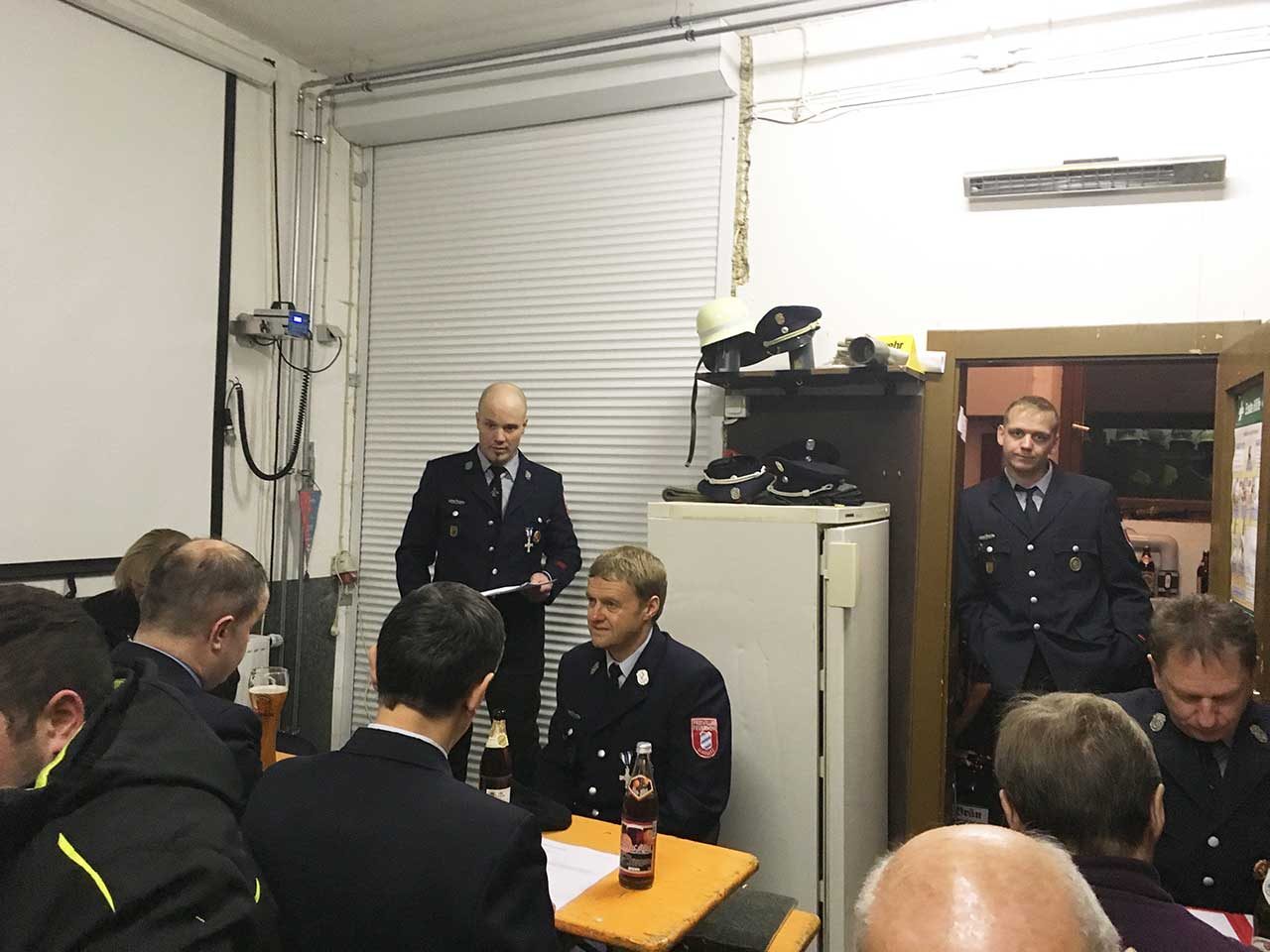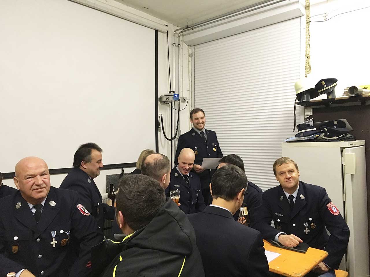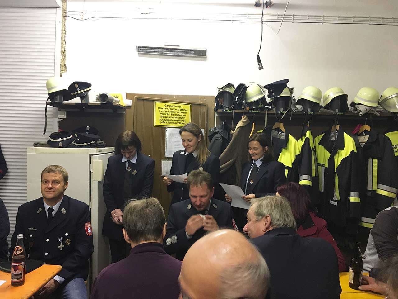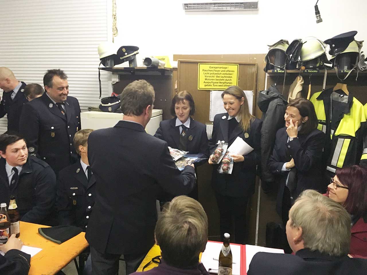 Kommandant Christian Schramm berichtete von zahlreichen Unterrichte und Übungen. Herausragend war die bestandene Leistungsprüfung im Oktober. Dabei mussten die beiden Kommandanten sehr viel Geduld aufbringen, da einige Kameradinnen und Kameraden erst kurz vorher ihren aktiven Dienst begonnen hatten. Somit mussten diese die Grundtätigkeiten erst erlernen. Das dies aber auch Spaß gemacht hatte bezeugten die Kameradinnen Annette Schramm, Jenny Schubert und Jacqueline Czapinski. Diese trugen ein selbst verfasstes Gedicht vor und überreichten Ihren Ausbildern Christian Schramm, Gerd Ellner und Mario Ratschko kleine Präsente.