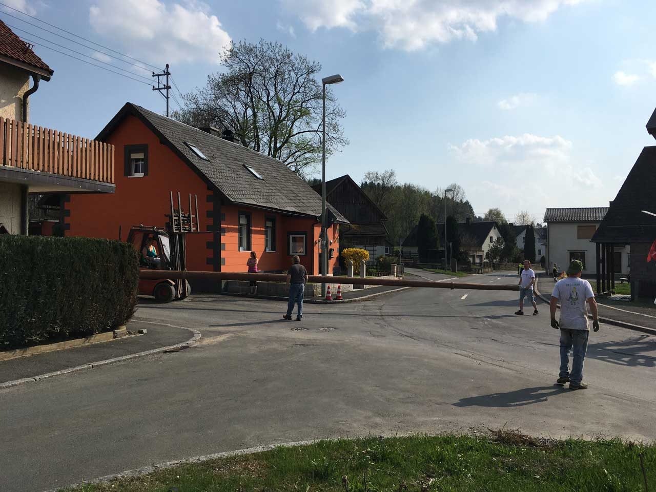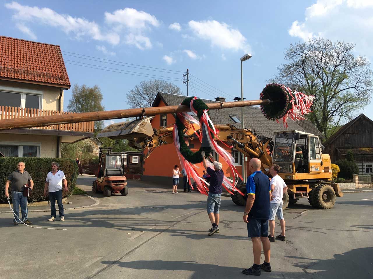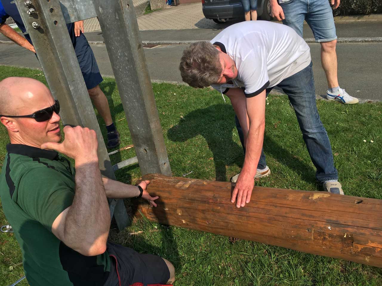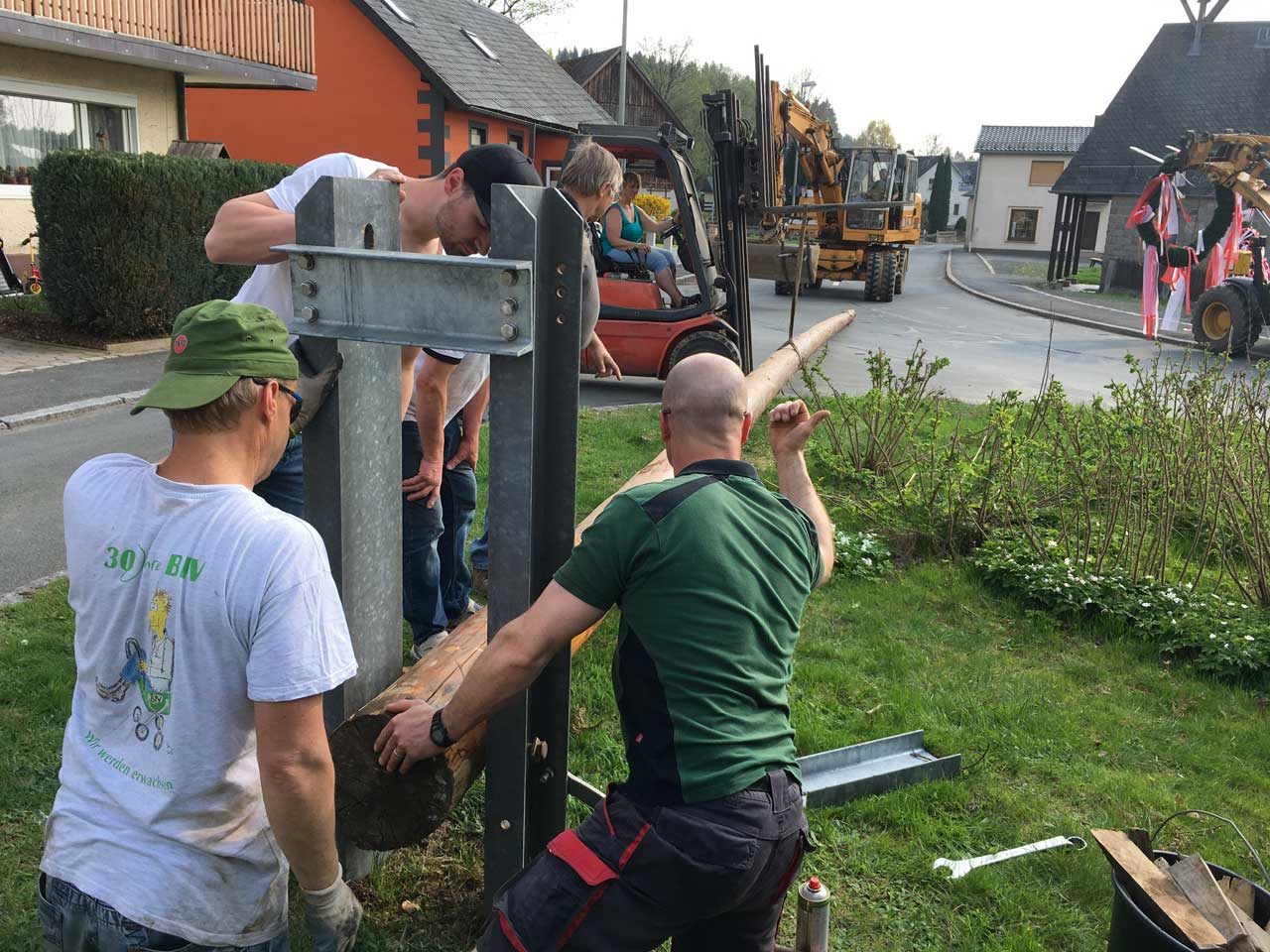 Das Aufstellen selbst wird durch den Fuhrpark der Firma Prell erheblich erleichtert. Das ausrichten des Baumes im Gestell erfordert doch einiges an Fingerspitzengefühl. Das ganze muss gut verkeilt und fest verschraubt sein, schließlich steht der Maibaum den ganzen Sommer bis zum Herbst in der Verankerung.