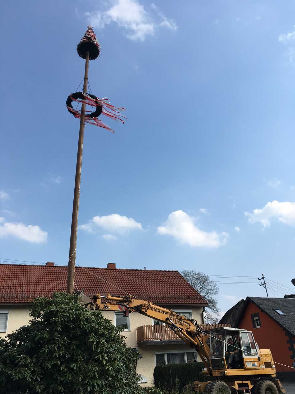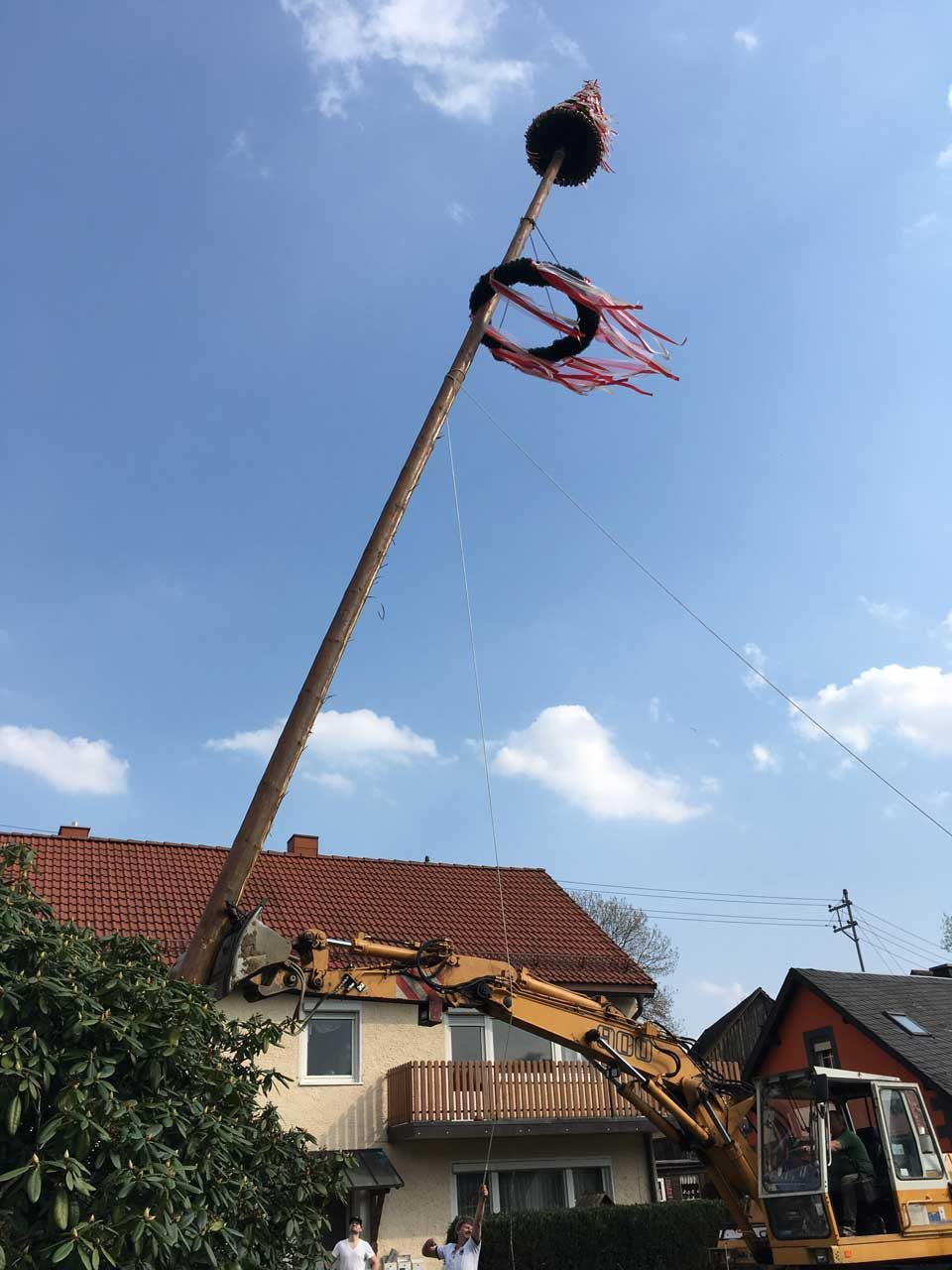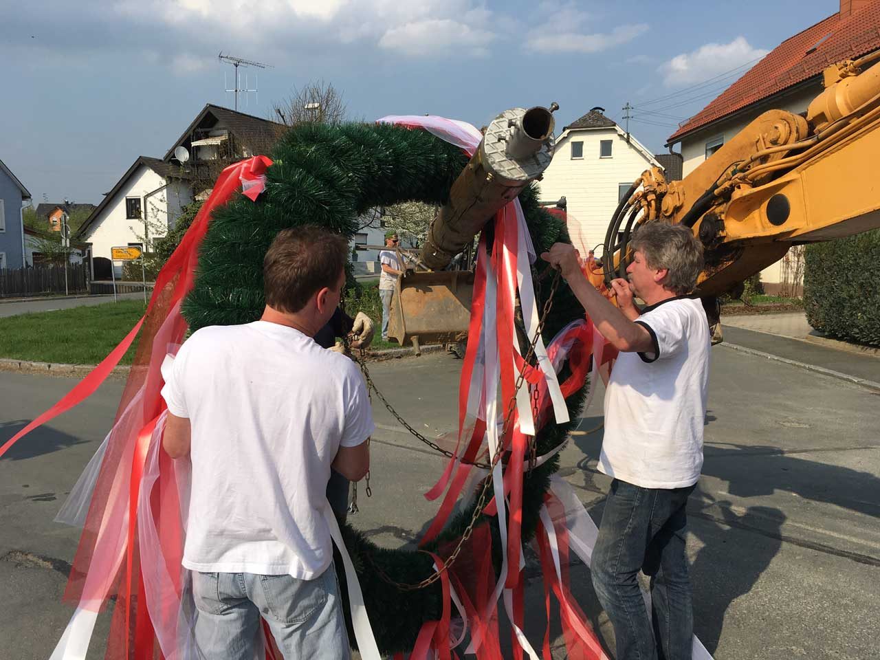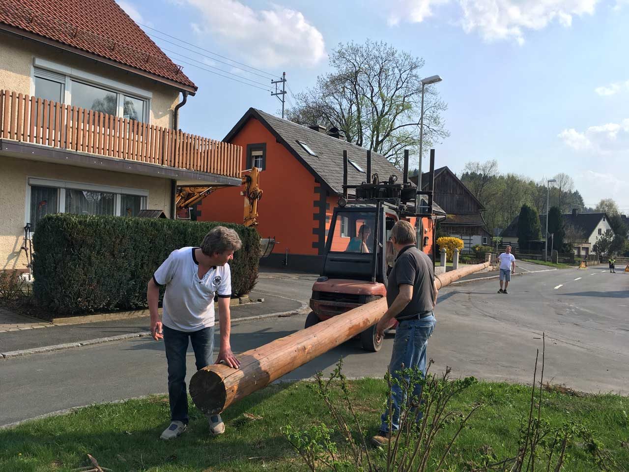 Das Aufstellen selbst wird durch den Fuhrpark der Firma Prell erheblich erleichtert. Das ausrichten des Baumes im Gestell erfordert doch einiges an Fingerspitzengefühl. Das ganze muss gut verkeilt und fest verschraubt sein, schließlich steht der Maibaum den ganzen Sommer bis zum Herbst in der Verankerung.