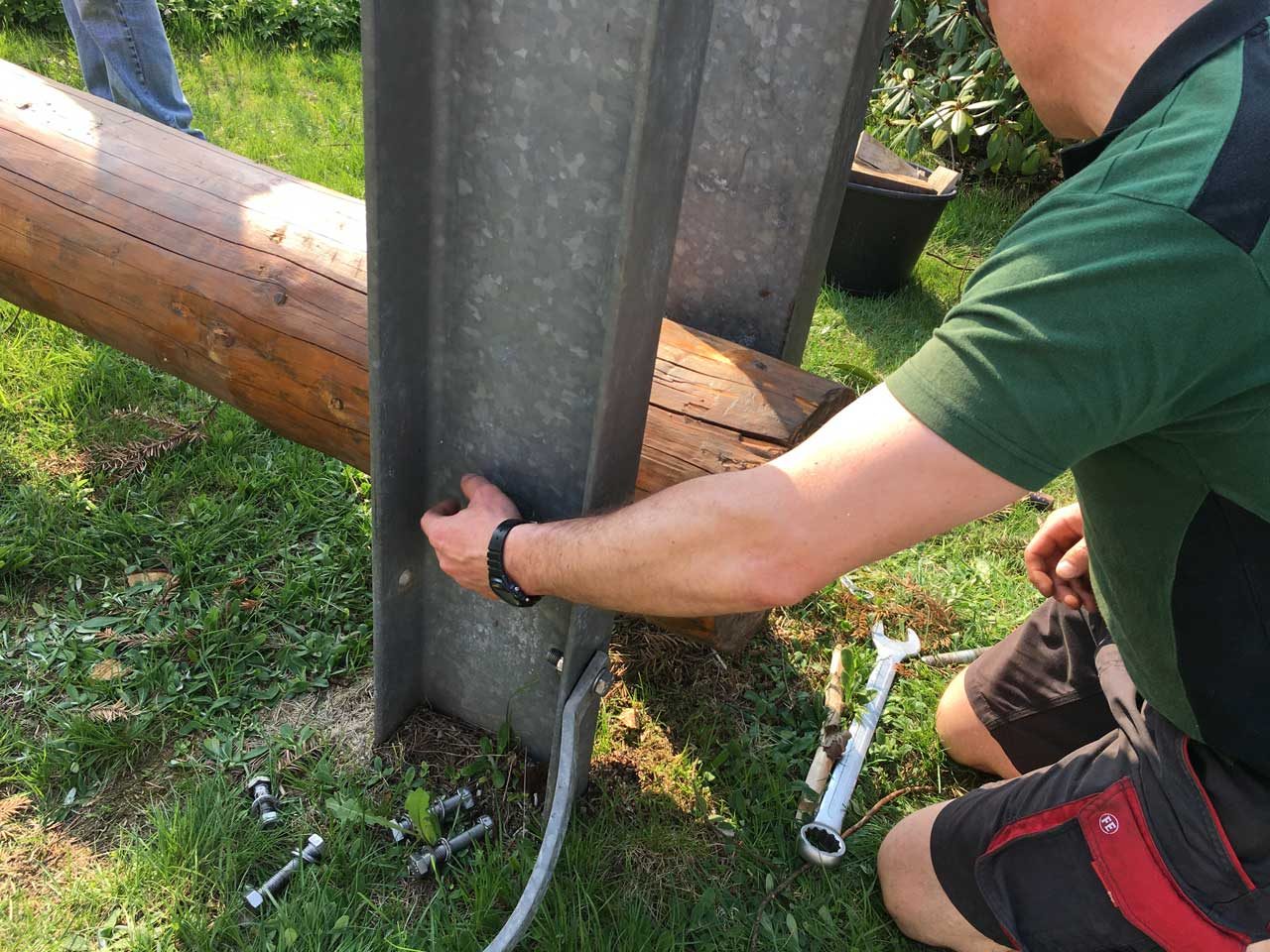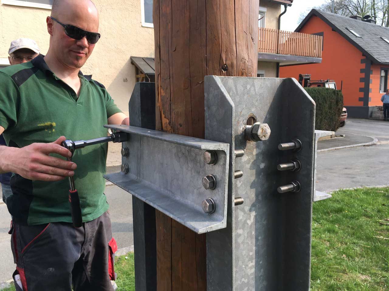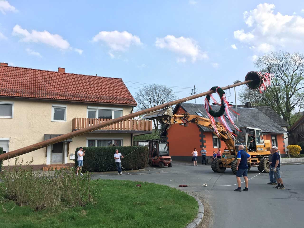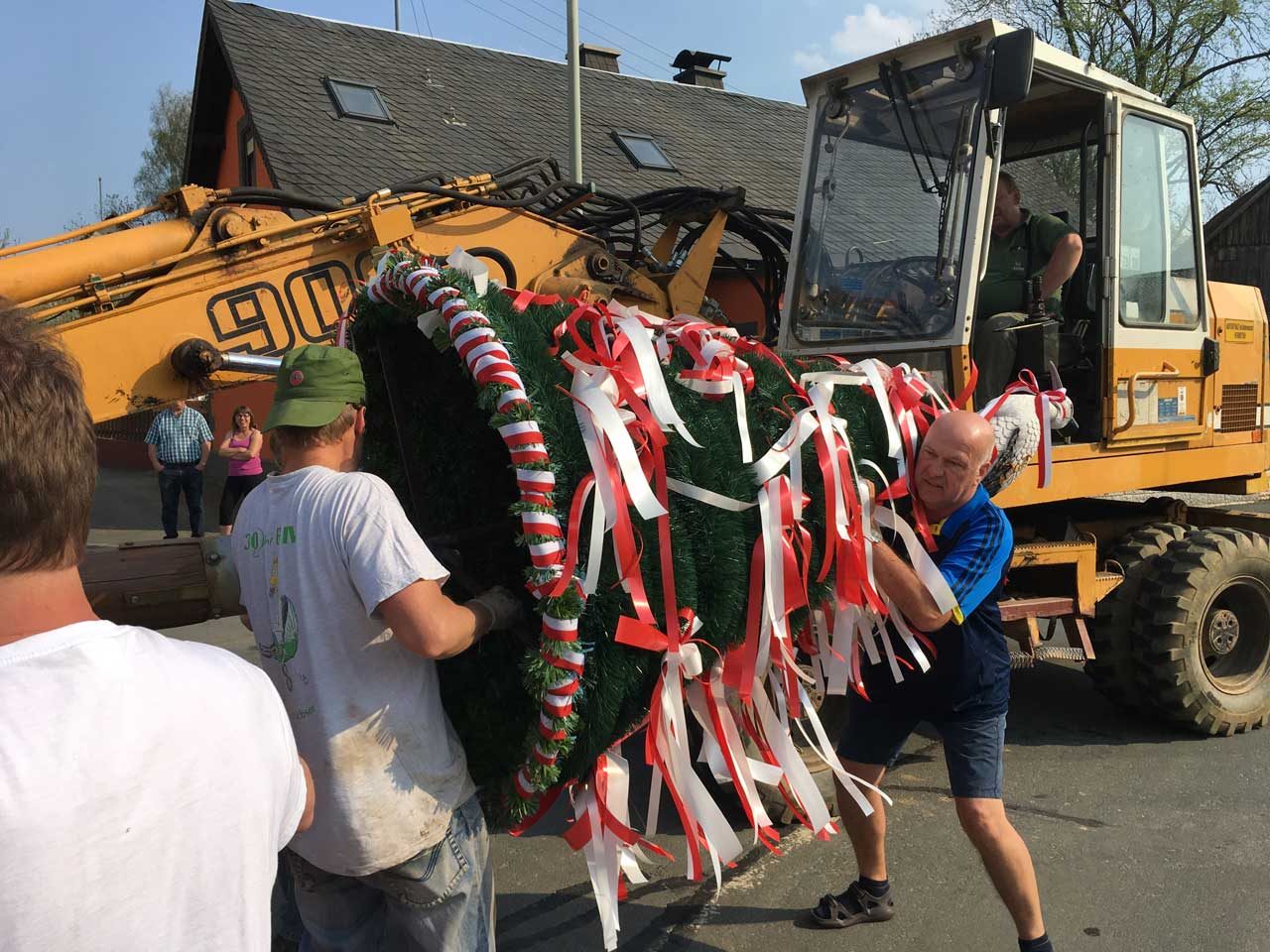 Das Aufstellen selbst wird durch den Fuhrpark der Firma Prell erheblich erleichtert. Das ausrichten des Baumes im Gestell erfordert doch einiges an Fingerspitzengefühl. Das ganze muss gut verkeilt und fest verschraubt sein, schließlich steht der Maibaum den ganzen Sommer bis zum Herbst in der Verankerung.