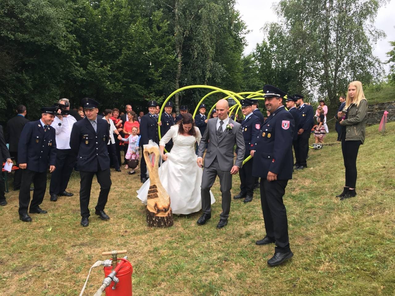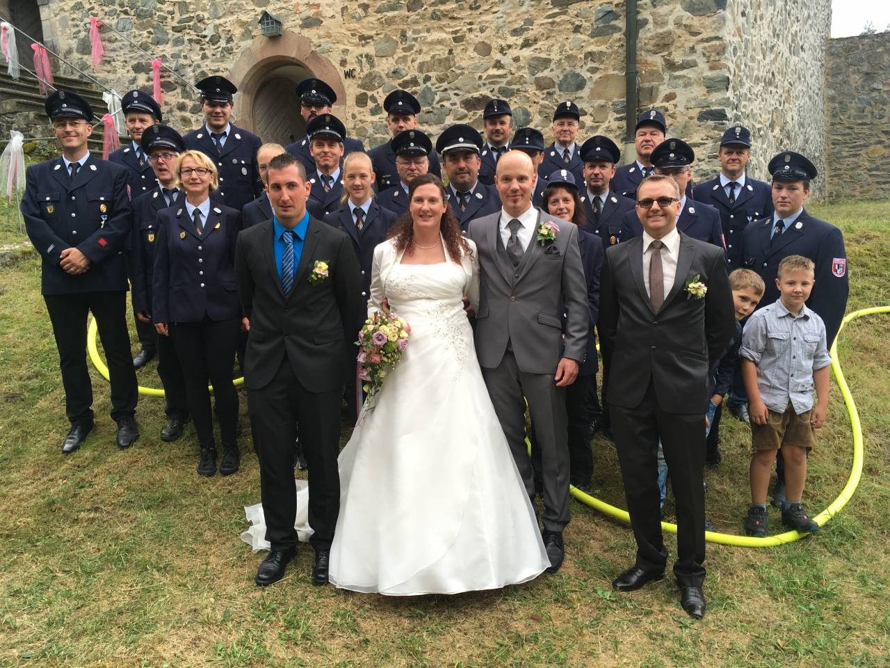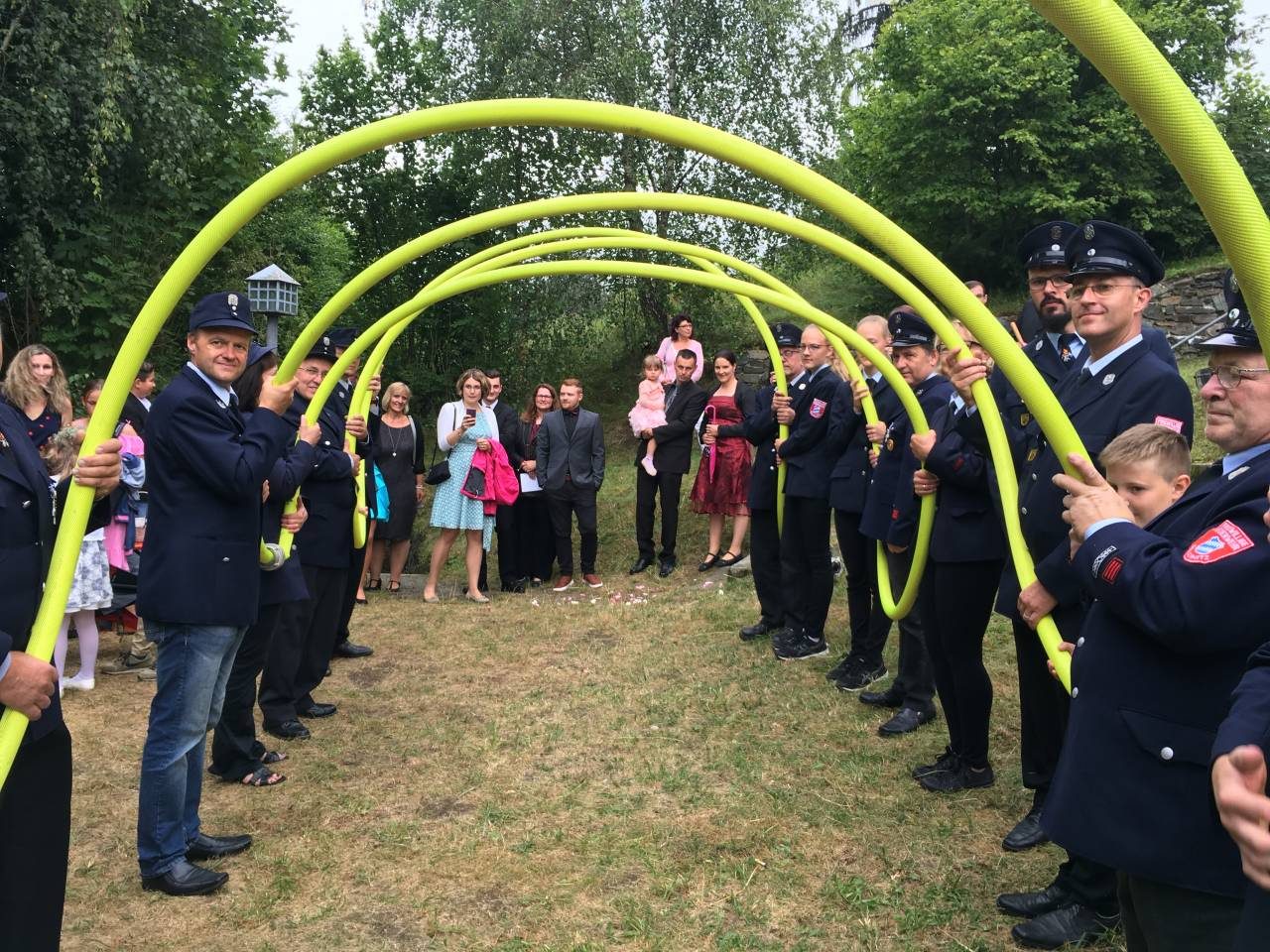 Die Feuerwehr Gundlitz stand zusammen mit den Kameraden aus Oelschnitz Spalier als ihr Vorsitzender Heiko Pittroff mit seiner frisch angetrauten Daniela die Kirche in Stein verließen. Beide mussten ein Spalier aus gefüllten Feuerwehrschläuchen durchschreiten. Danach musste sich das Brautpaar an der Kübelspritze beweisen. Ziel war es zwei brennende Ringe als Symbol für die Ehe gemeinsam zu löschen. Natürlich meisterte das Brautpaar, beide sind aktive Feuerwehrleute, das mit Bravour.