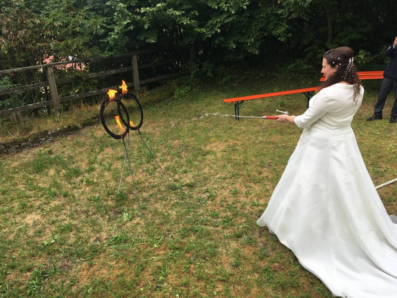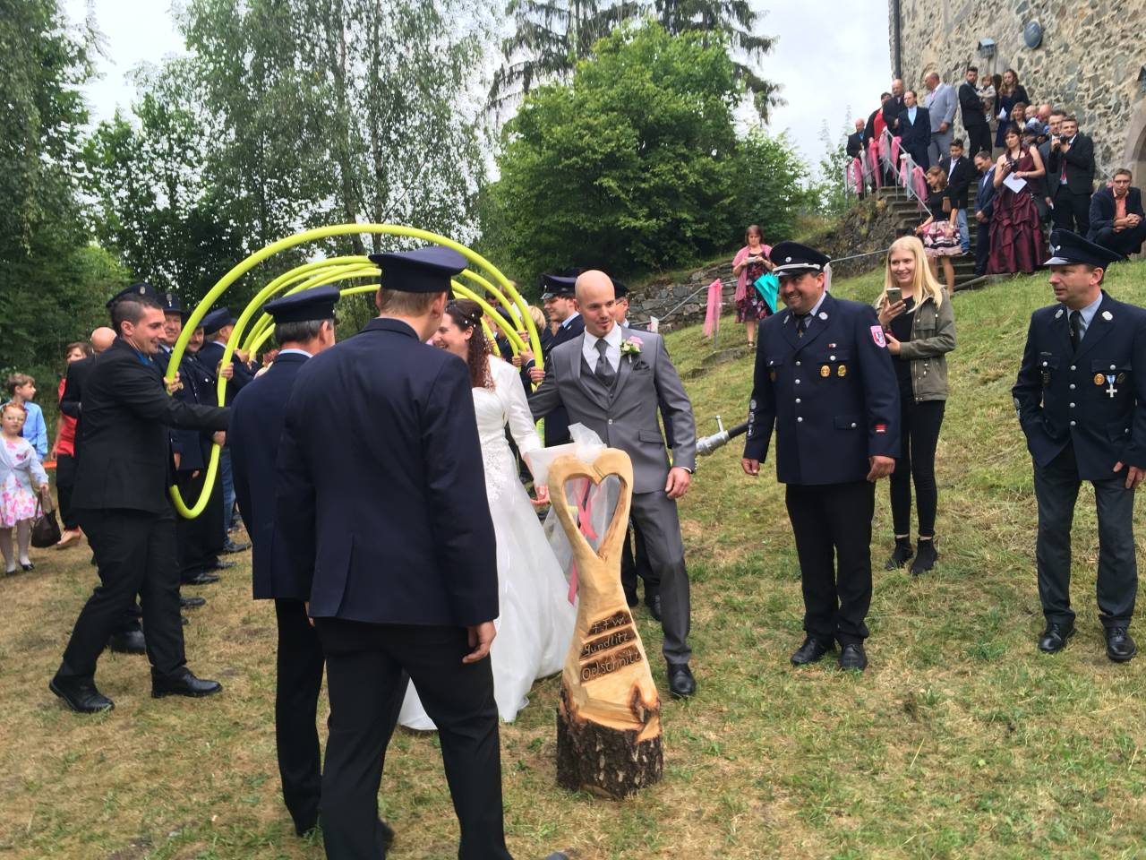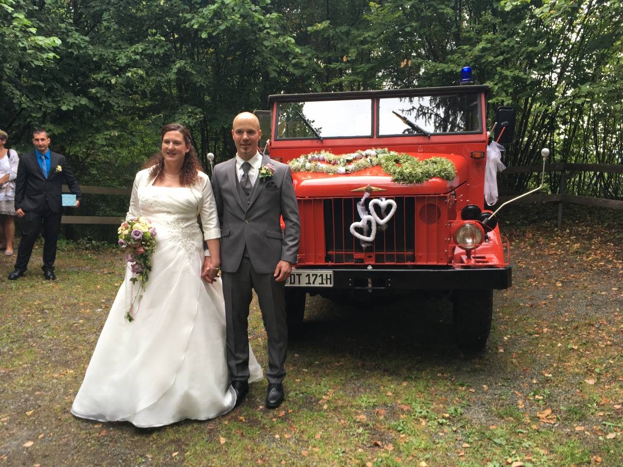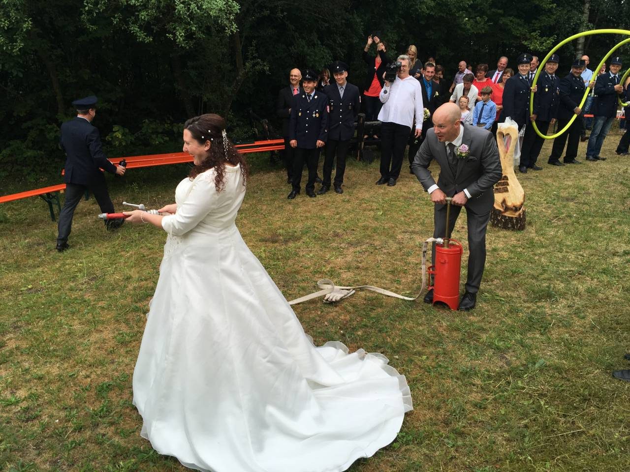 Die Feuerwehr Gundlitz stand zusammen mit den Kameraden aus Oelschnitz Spalier als ihr Vorsitzender Heiko Pittroff mit seiner frisch angetrauten Daniela die Kirche in Stein verließen. Beide mussten ein Spalier aus gefüllten Feuerwehrschläuchen durchschreiten. Danach musste sich das Brautpaar an der Kübelspritze beweisen. Ziel war es zwei brennende Ringe als Symbol für die Ehe gemeinsam zu löschen. Natürlich meisterte das Brautpaar, beide sind aktive Feuerwehrleute, das mit Bravour.