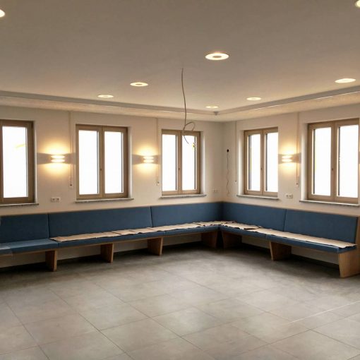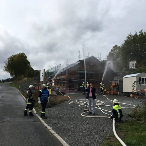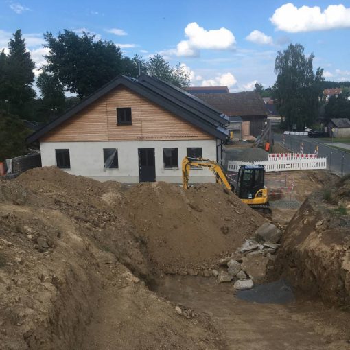 Im Juli unterbrach die Baufirma die Arbeit an den Außenanlagen aufgrund Urlaub und Materialnachschubproblemen. Am Gebäude wurde der finale Aussenputz angebracht. Auch im Inneren ging es mit einigen Arbeiten weiter. Am 15. Juli traf sich die Dorfgemeinschaft zum ersten Mal im Dorfgemeinschaftshaus. Dies fand regen Zuspruch.