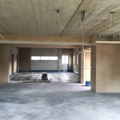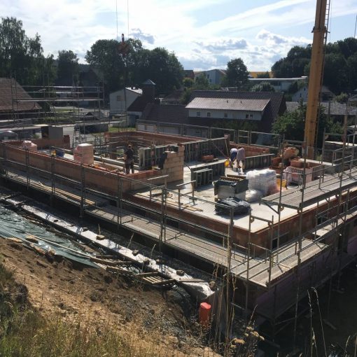 Auch im September wurde fleissig von der Baufirma an den Außenanlagen gearbeitet. Ums Haus herum wurde gepflastert, außerdem wurden alle Randsteineinfassungen gesetzt und der Gehsteig an der Straße erstellt. In Eigenleistung wurde dann die Beschriftung des Gebäudes vorgenommen, sowie Beamer, Lautsprecher und Leinwand installiert sowie fahrbare Regale aufgebaut.
