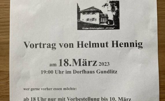 Einen sehr kurzweiligen und interessanten Abend erlebten die Besucher des Vortrages über Winklas von Helmut Hennig. Davor zauberte die Gundlitzer Küchencrew feines goldgelbes Kassler mit Kraut und Brötchen auf den Tisch. Frisch gestärkt konnte man dann Worten und Erzählungen von Helmut Hennig lauschen. Er berichtete von den früheren Zeiten, vor allem […]