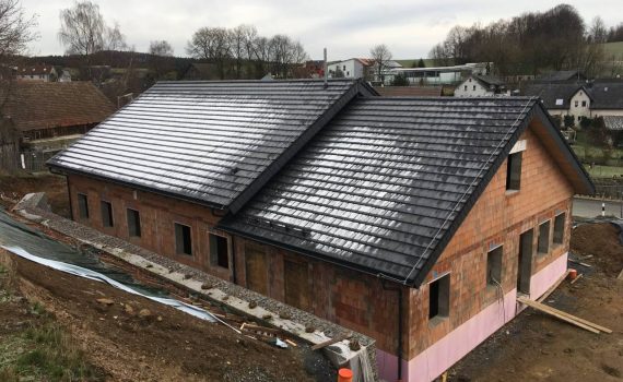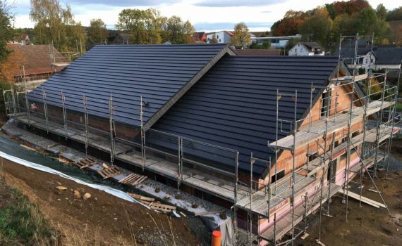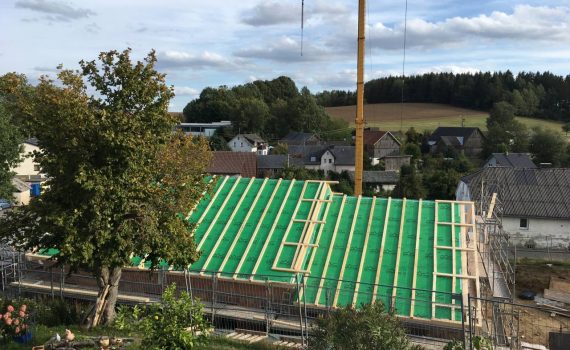 Im Oktober wurden die Zimmererarbeiten am Dachstuhl fertiggestellt und das Dach durch die Firma Weberpals aus Stammbach gedeckt. Weiterhin wurden auch die Dachrinnen angebracht, sowie die Verkleidungen an den Giebelseiten mit Schiefervertäfelungen.