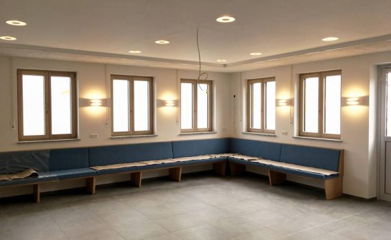 Es geht langsam auf die Zielgerade was den Innenausbau betrifft. Im Eingangsbereich sowie im Dorfgemeinschaftsraum wurden Möbel installiert und geliefert. Weiterhin ist unser Elektrikerprofi Gerd Ellner mit der Elektroinstallation im Feuerwehrbereich beschäftigt. Die Lampen und Elektrik im Gemeinschaftsbereich ist so gut wie fertig.